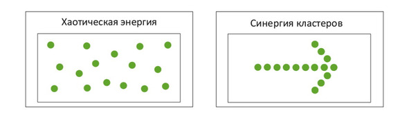 Все сознательные кластеры созданы по принципу синергии. Определение синергии говорит, что эффект от взаимодействия двух или более энергий людей существенно превосходит эффект каждой отдельной энергии человека в виде простого суммирования. Проще всего объяснить феномен синергии фразой: «Один плюс один равно три». Еще старые пословицы утверждали тоже самое: Веник не переломишь, а по пруту весь веник переломаешь; Друг за дружку держаться – ничего не бояться; Дружный табун волков не боится. При объединении людей общим делом, они не только вместе работают умственно и физически, но и их мысли направленны в одну сторону – имеют одинаковую частоту.