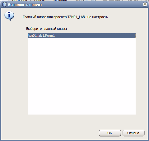 Появиться окно для указания главного класса в программе. Необходимо выбрать класс и именем формы и нажать «ОК». После этого запустится программа.