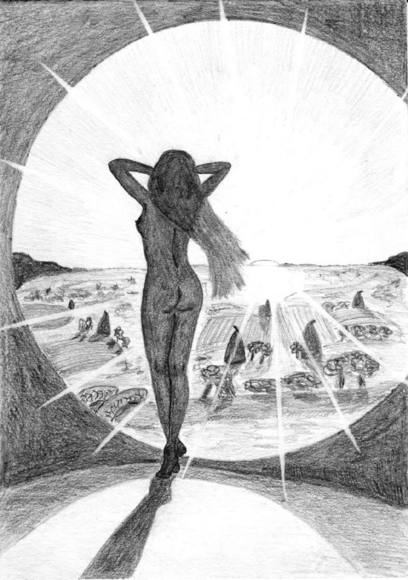 Окно было больше её роста, начинаясь от пола и оканчиваясь на высоте поднятых рук. Она стояла у окна практически вплотную к стеклу. Вот она неспешно подняла руки, провела обеими ладонями под ушами и соединила пальцы в замок на шее сзади. Тряхнув головой, она заставила свои длинные слегка волнистые волосы расправиться поверх рук. Уперев основание головы в замок из пальцев, она развела локти максимально широко в стороны и медленно прогнулась в спине, потягиваясь после сна. Закрыв глаза, она в такой позе нежилась в зелёных лучах восходящего солнца. Её молодое светлое тело впитывало свежесть утра и ощущало тепло от солнца, проходящее сквозь хрусталь окна. Переливчатый зелёный луч нежно ласкал её прекрасное лицо, изящную шею, скользя по её округлым обводам и тонкой талии, первый свет солнца этого дня отбрасывал длинную тень от этой нагой красавицы на пол, на ложе, на стену.