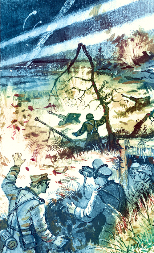 И вдруг! Что такое?! Не могут понять фашистские солдаты, что же вокруг случилось? Не от них, не со стороны фашистских позиций, а оттуда, от русских, прорвав рассвет, огненным гневом ударили пушки. Покатился смертельный вал. Вот подошёл к окопам. Вот заплясал, закружил над окопами. Вот поднял землю к небу. Вот вновь металлом забил, как градом.