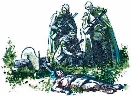 Второй раз в атаку идут фашисты. Их больше теперь и огонь сильнее. Стойко стоят гвардейцы. Удержали опять рубеж. Перевязали друг другу раны. Снова готовы к бою.