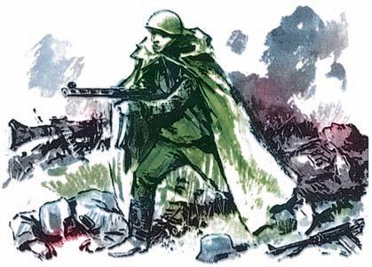 Залегли солдаты. Ведут перестрелку с фашистами. Кончился бой. Подсчитали солдаты убитых врагов. Двадцать человек оказалось у того места, откуда вел огонь рядовой Трусов.