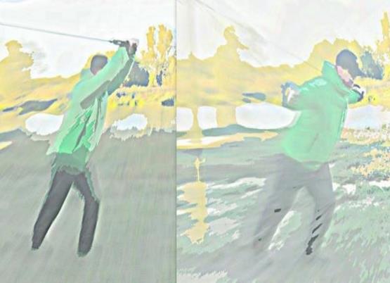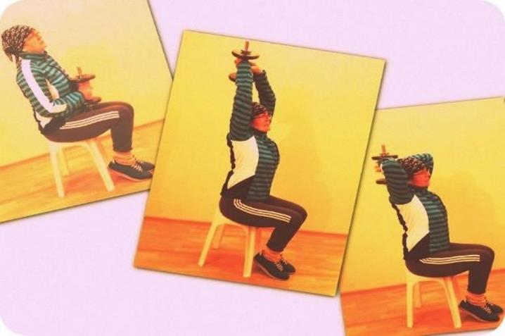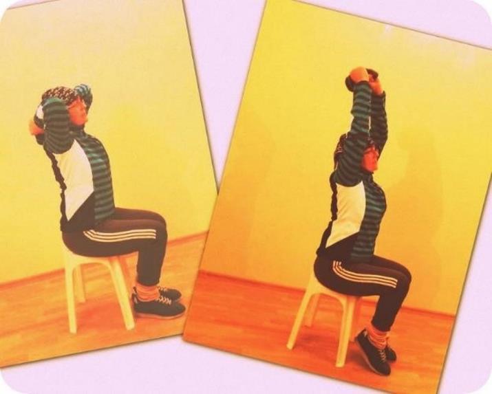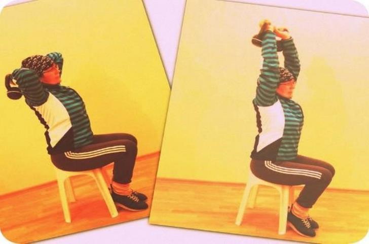 Исходное положение – сидя на надёжной опоре, снаряд за головой в согнутых руках.