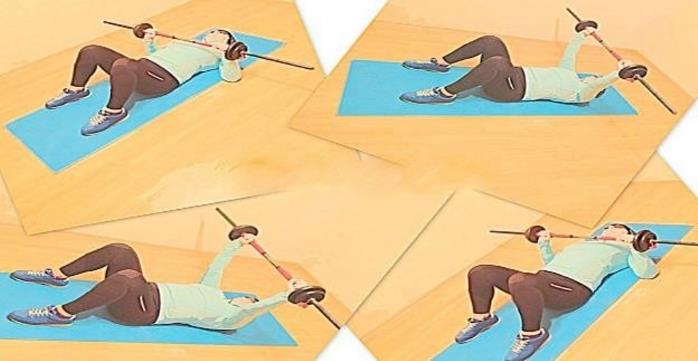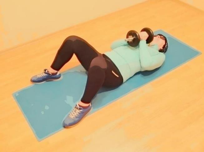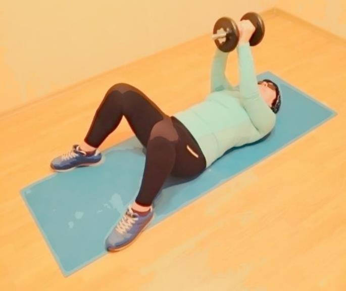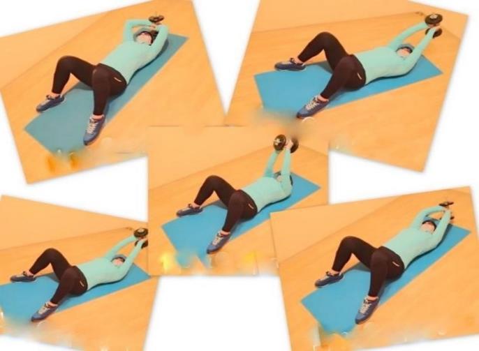 Исходное положение – лёжа на полу, гантель в согнутых руках перед грудью, плечи прижаты к корпусу, ноги согнуты и расставлены в стороны.