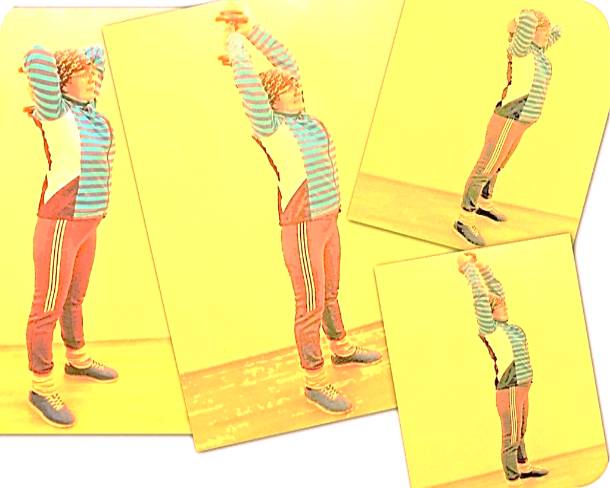Исходное положение – ноги на ширине плеч, снаряд расположен за головой в согнутых руках.