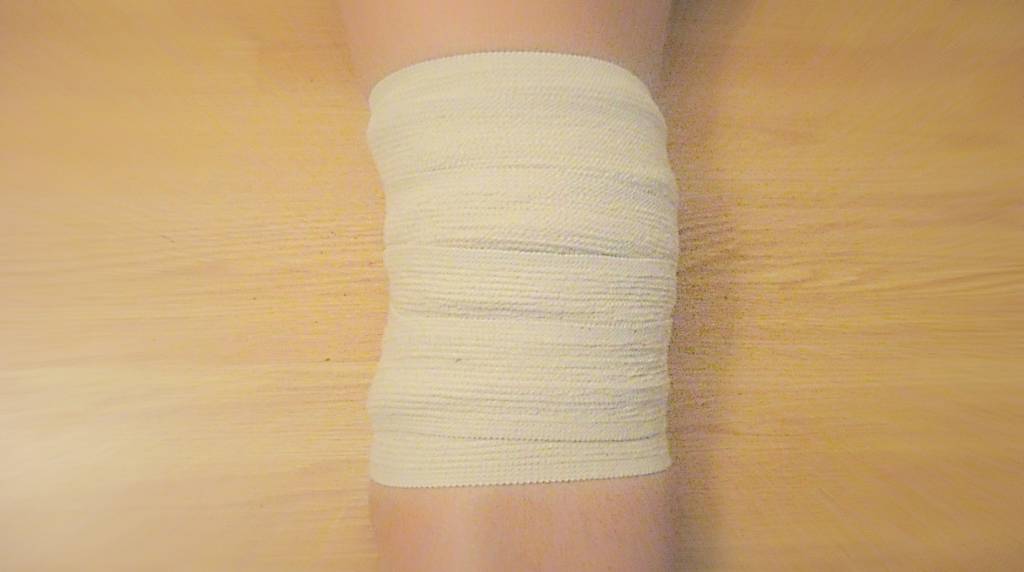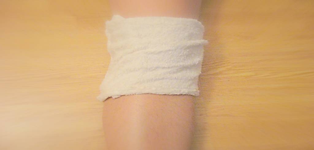 Хорошо впитывающую х/б ткань или махровую, как на снимке, намочить в растворе, несильно отжать и наложить повязкой на колено. Учтите, солевая повязка работает, пока она влажная.