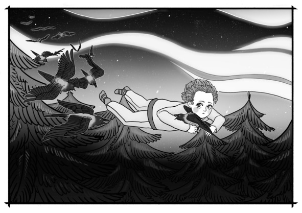Ангел и мальчик стремительно скользнули к лесу. Пролетая над вершинами, Ангел неожиданно для Кирюши издал странный, сильный и чем-то страшный звук. Птицы взметнулись с веток в небо, закручиваясь в воронку. Ангел и мальчик полетели навстречу потоку, и птицам приходилось уворачиваться от столкновения с ними.