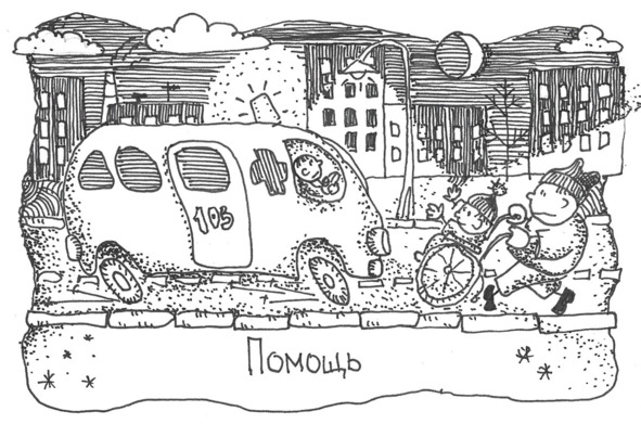 Карлсон неожиданно столкнул коляску с тротуара и выкатил ее на проезжую часть улицы. Прямо в поток машин! Заревел сигнал автомобиля, и в метре от коляски остановилась машина скорой помощи. Карлсон замахал руками водителю. Из пассажирской двери выскочил врач – мужчина в сине-зеленой шапочке с красным крестом.
