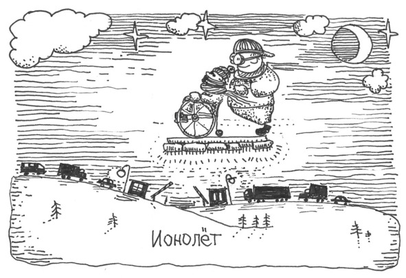 На окраине села машина остановилась. Карлсон влез в салон, подмигнул Малышу, проверил крепление инвалидной коляски к платформе ионолета, перевернутой иголками вниз и установленной на доски, чтобы не погнулись иголки. Затем встал сзади коляски, взявшись руками за ручки, потянул шнурок, привязанный к полотну фольги и… Под досками засветился бледный голубой свет.