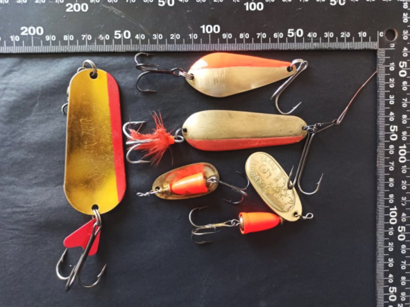 4. Окуневые латунные блесны для быстрого (вверху), среднего (по центру) течения и тихой воды (внизу).