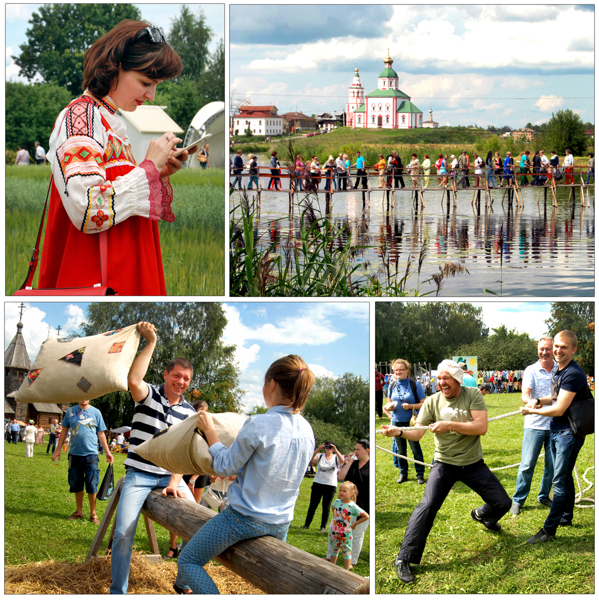 «НА ДНЕ ОГУРЦА В СУЗДАЛЕ». 2015 год. Вверху слева – «Милому надо позвонить». Вверху справа – посетители праздника идут через навесной мост. Внизу слева – игра «Бой подушками». Внизу справа – игра «Перетягивание каната»