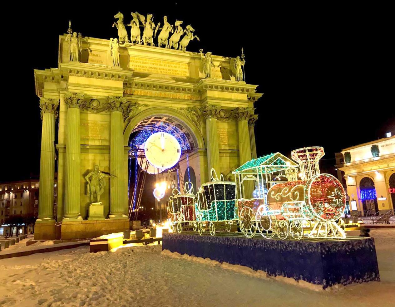 Ежегодно перед аркой «Нарвские ворота» размещают праздничную иллюминацию в виде небольшого детского паровозика и нескольких вагонов. Это место находится недалеко от станции метро «Нарвская», и раньше оно было окраиной города. И тут была небольшая железная дорога в сторону Петергофа. Видимо, поэтому в новогодней иллюминации используется детская железная дорога.