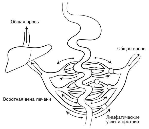 Всё что мы съели, в итоге попадает кровь. Белки и углеводы расщепляются до аминокислот и сахаров. Они попадают в кровь сразу. Небольшие сосуды в итоге сливаются до более крупных и впадают в портальную вену, которая впадает в печень. Путь жиров более извилист. Часть жиров попадает в портальную вену и в печень, так же как белки и углеводы, а другая часть жиров попадает в лимфатические сосуды, затем, минуя печень, сразу в общую кровь.