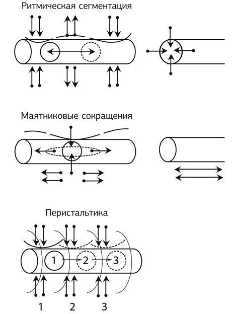 Ритмическая сегментация. Кишечник сжимается то на одном участке (сегменте) длиной 1–2 см, то на другом. Еда перемещается туда-сюда. Движение обеспечивается кольцевидными мышцами. С их помощью кишечник перетирает пищу между стенками. Эти движения происходят в ритме 8–10 раз в минуту.