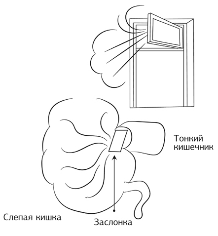У клапана характер хуже, чем у бабки – вахтерши на входе в общежитие. Баугиниева заслонка соглашается открыться только при наличии нескольких условий. Первое – наличие пропульсивной волны перистальтики. Второе – наличие большого количества содержимого в конечном отделе тонкой кишки. Третье – пустой начальный отдел толстой кишки. За выполнением второго и третьего условий следят механические рецепторы. Они реагируют на растяжение стенки кишечника спереди и сзади заслонки. Если все эти условия соблюдены, клапан соглашается открыться и пропускает содержимое со скоростью 15 мл в минуту. Всего через него проходит около 1,5 литра за сутки.