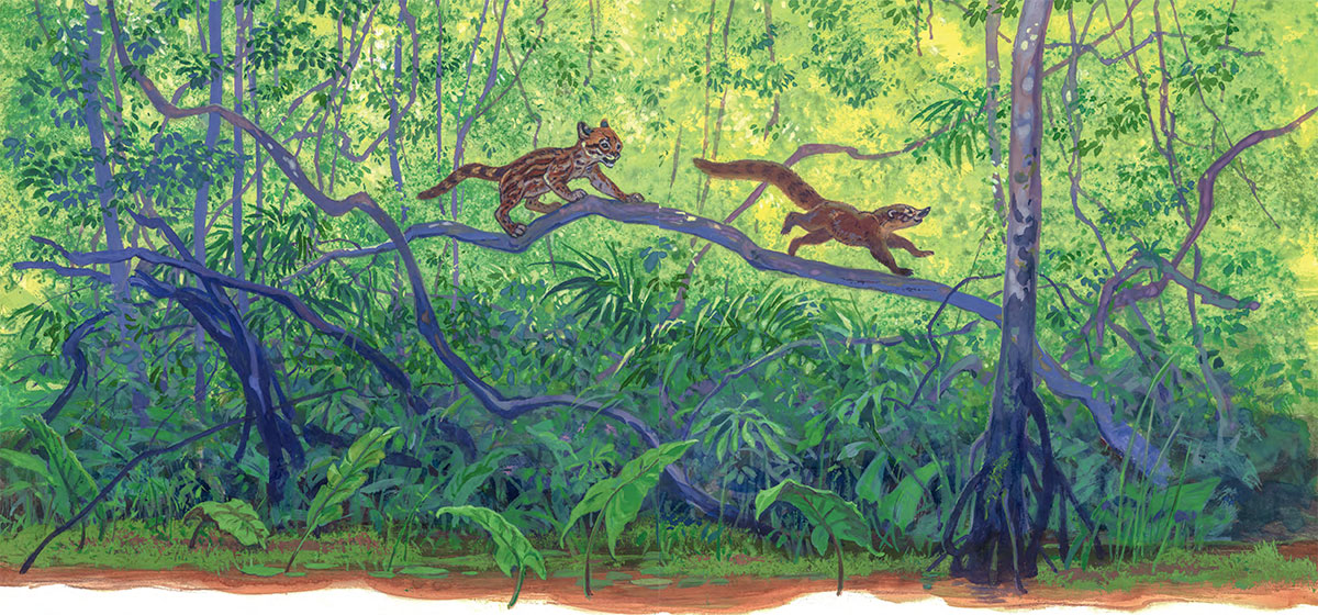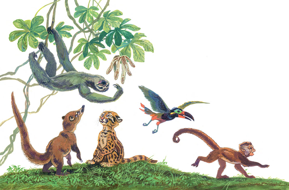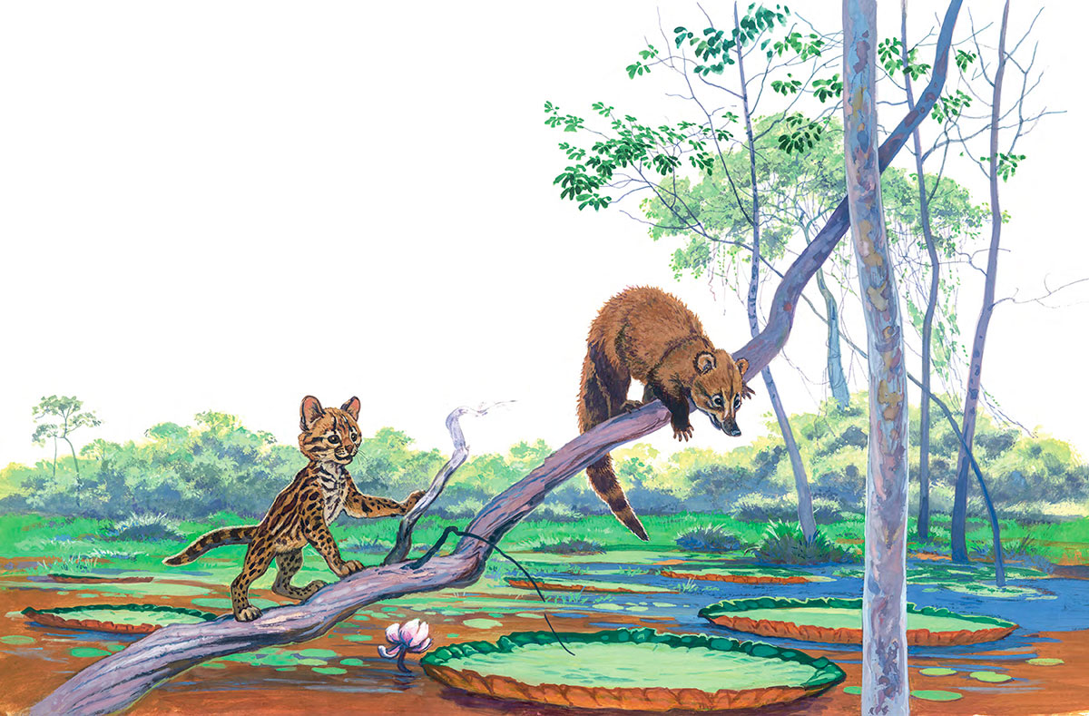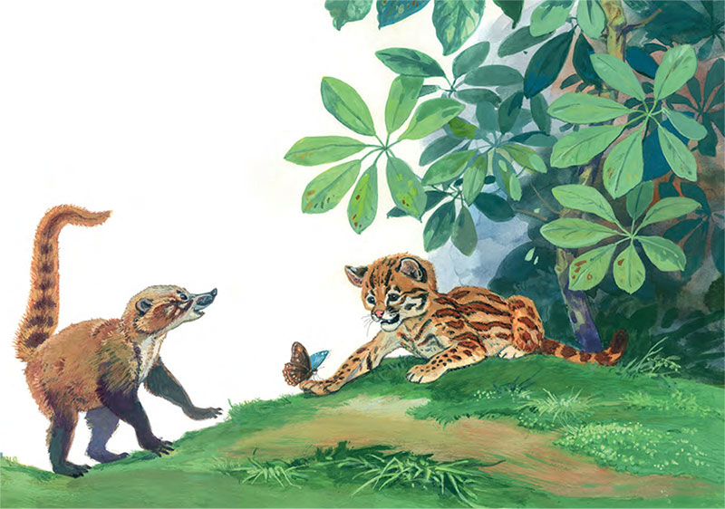 Для начала надо рассказать, о ком пойдет речь в этой истории. Что это за звери с такими чудными названиями? А чудные и непривычные они только для нас. В Бразилии все знают, как выглядят коати[1] и жагуатирика[2]. Первый зверь – это носуха из рода енотов. Енота-то знают все! А жагуатирика – это небольшой ягуар, его еще называют оцелот, то есть всем теперь понятно, что этот зверь – хищный. Но в нашей сказке они еще маленькие и вполне могли подружиться и играть вместе!