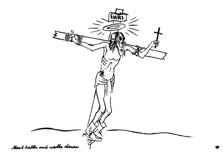 Этот рисунок в 1927 г. был сделан немецким художником-экспрессионистом Георгом Гроссом как декорация для антивоенного спектакля «Похождения бравого солдата Швейка», который ставили в одном из берлинских театров. Вскоре «Христос в противогазе», вместе с другими зарисовками Гросса, был опубликован в отдельной книжке. А сам он вместе с издателем в 1928 г. попал под суд по 166-й статье УК Веймарской республики об оскорблении религии, т. е., по сути, за богохульство.