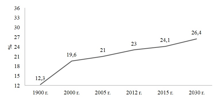 Рисунок 1 – Динамика роста доли мусульман в общей численности населения планеты