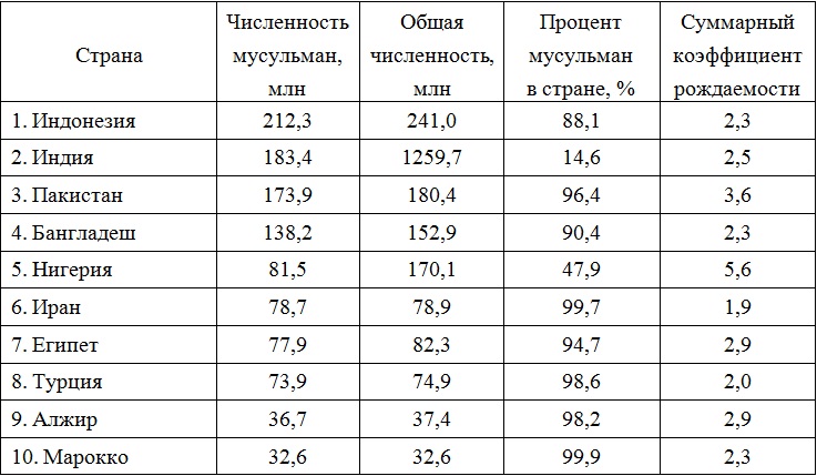 Таблица 2 – Демографические данные по 10 странам с самым большим числом мусульман