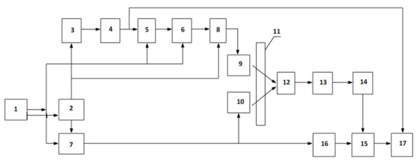 Next, the signal from the output of the threshold device – 14 is fed to one of the inputs of the matching circuit – 15. A signal is sent to the other input of the coincidence circuit – 15 from the output of the second differentiating device – 16. From the moment of comparison, a number of pulses appear at the output of the coincidence circuit – 15, which arrive at the counting input of the counter – 17. At the beginning of the next exponent, the counter – 17 receives rectangular pulses from the output of the single—vibrator – 4 at the input "Zero setting" and the counter – 17 is prepared for the next cycle.