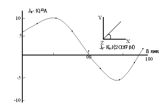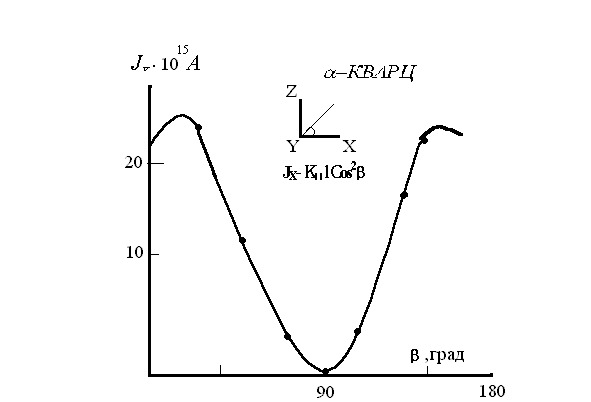 Figure 1 shows the angular instability of the photovoltaic current in a native a-quartz crystal with a natural color. The crystals were suspended in the impurity spectral region (l- 300—500 nm, a2 = 2cm -1) at room temperature. Figure 1 shows two orientational angular dependence Jx (b) when illuminated in the direction of the a-z axis, while for a-quartz K11 = (1—3). 10—13 A. cm (W) -1.