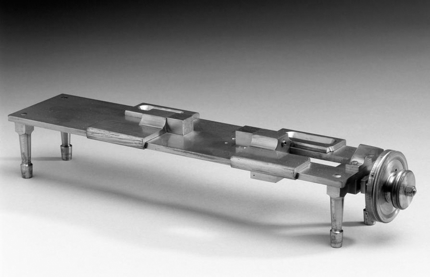 As with Gascoigne’s invention of a century before, the bench micrometer’s measurement was based on the use of a long and skillfully made screw. It employed the basic principle of a lathe, except that instead of having a slide rest with cutting or boring tools mounted upon it, there would be two perfectly flat blocks, one attached to the headstock, the other to the tailstock, and with the gap between them opened or closed with a turn of the leadscrew.