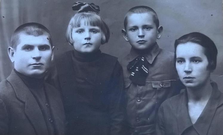 На фото: 8-летняя Лидочка с братом Шуриком, папой и мамой. 1929 год.