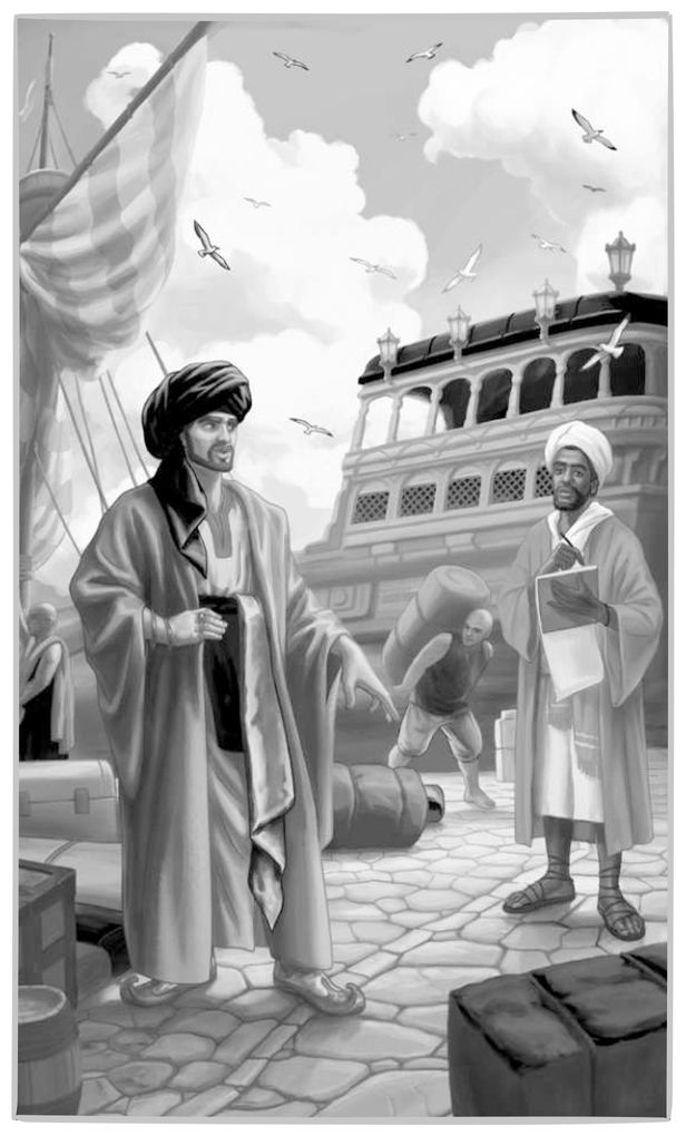 Однажды Синдбад стоял, как всегда, на берегу моря, грустный и печальный. В это время подошёл к пристани большой корабль, на котором было много купцов и матросов. Все жители города выбежали на берег встречать корабль. Матросы стали выгружать товары, а Синдбад стоял и записывал. Под вечер Синдбад спросил капитана: