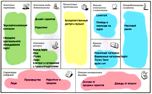 Описывая бизнес, следует заполнить каждый блок несколькими ключевыми элементами, на которые опирается бизнес-модель. В качестве примера представлена бизнес-модель Apple iPod/iTunes, оформленная по шаблону.