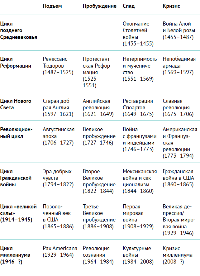 Нил Хау считает, что в основе современной истории лежит одна удивительная закономерность: последние шесть столетий англоамериканское общество, а отчасти и весь современный мир, развивается в хорошо заметных циклах – saeculum – длиною в человеческую жизнь.