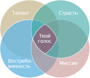 Как к этому прийти? Важно найти свой голос. Посмотри на схему ниже. Ты видишь четыре круга: талант, страсть, востребованность и миссия. Талант – это то, в чем ты действительно хорош, дело, которое само идет в руки. Страсть – то, что тебе нравится делать. Востребованность – то, в чем нуждается мир и за что люди будут готовы платить тебе деньги. Миссия – то, что ты считаешь важным делать. На пересечении этих четырех кругов и находится твой собственный голос.