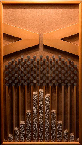 Английский антрополог, географ, психолог Френсис Гальтон (1822–1911) одним из первых начал анализировать наследственность. Он рассматривал рост отцов и их сыновей, и выявил закономерность, известную как «регрессия к средним величинам». То есть высока вероятность, что у высокого отца сын будет ниже ростом (и наоборот). Если бы это было не так, то тогда средний рост населения серьезно менялся бы, но он остается стабильным. Чтобы наглядно показать этот процесс, он сконструировал «доску Гальтона». Если бросить один шарик, то предсказать его размещение сложно, но при тысяче общее распределение статистикам сегодня известно.