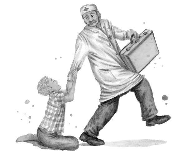 Детский Доктор бежал по улице и тащил за собой дрожащего Петьку. Вернее, Петька летел по воздуху и только изредка отталкивался от земли носками своих ботинок.