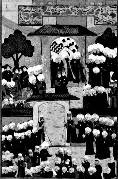Похороны Нурбану, миниатюра, 1592 г. Советы Нурбану сыну-султану, «содержали столько благоразумия и осмотрительности, что можно было подумать, будто они исходят от искусного, умного и очень опытного государственного деятеля…»