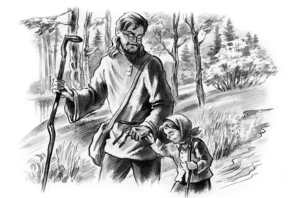 Дорога оказалась труднее, чем думала девочка. Солнце припекало довольно сильно, маленьким ножкам нужно было сделать очень много шагов еще в селе и еще гораздо больше по лугам, прежде чем они добрались до поросшей травой дороги среди кустарника, тоже плохо защищавшего от полуденного солнца. Сначала Соня не замечала трудностей. Ее внимание привлекали то пестрые цветы, колышущиеся в траве, то не менее пестрая бабочка или бирюзовое коромысло, то внезапно выпорхнувшая из травы птичка, то мохнатый шмель, с низким гудением перелетавший с цветка на цветок. Однако постепенно все это надоело, и все сильнее начинала чувствоваться и жара, и усталость, и жажда. Об усталости приходилось молчать, хотя шаги становились все меньше и медленнее, и под конец ноги совсем заплетались. Впрочем, девочка надеялась, что папа ничего не замечает, и держалась насколько возможно стойко. Другое дело жажда. Тут уговора не было, а солнце жгло, а вдоль дороги тянулось узкое, поросшее осокой болотце, на средине которого соблазнительно поблескивала вода. Но достать ее было невозможно: берега и дно болотца покрывал вязкий ил, в котором тонули ноги, и чистая на вид вода мутилась гораздо дальше, чем можно было достать рукой. Да и что пользы, если бы отец Сергий даже сумел достать эту воду? Сам-то он еще мог бы напиться, но Соне в пригоршне воды не натаскаться. До караулки ли тут, со всем, что в ней еще оставалось! Прежде нужно найти воду, которую можно пить!