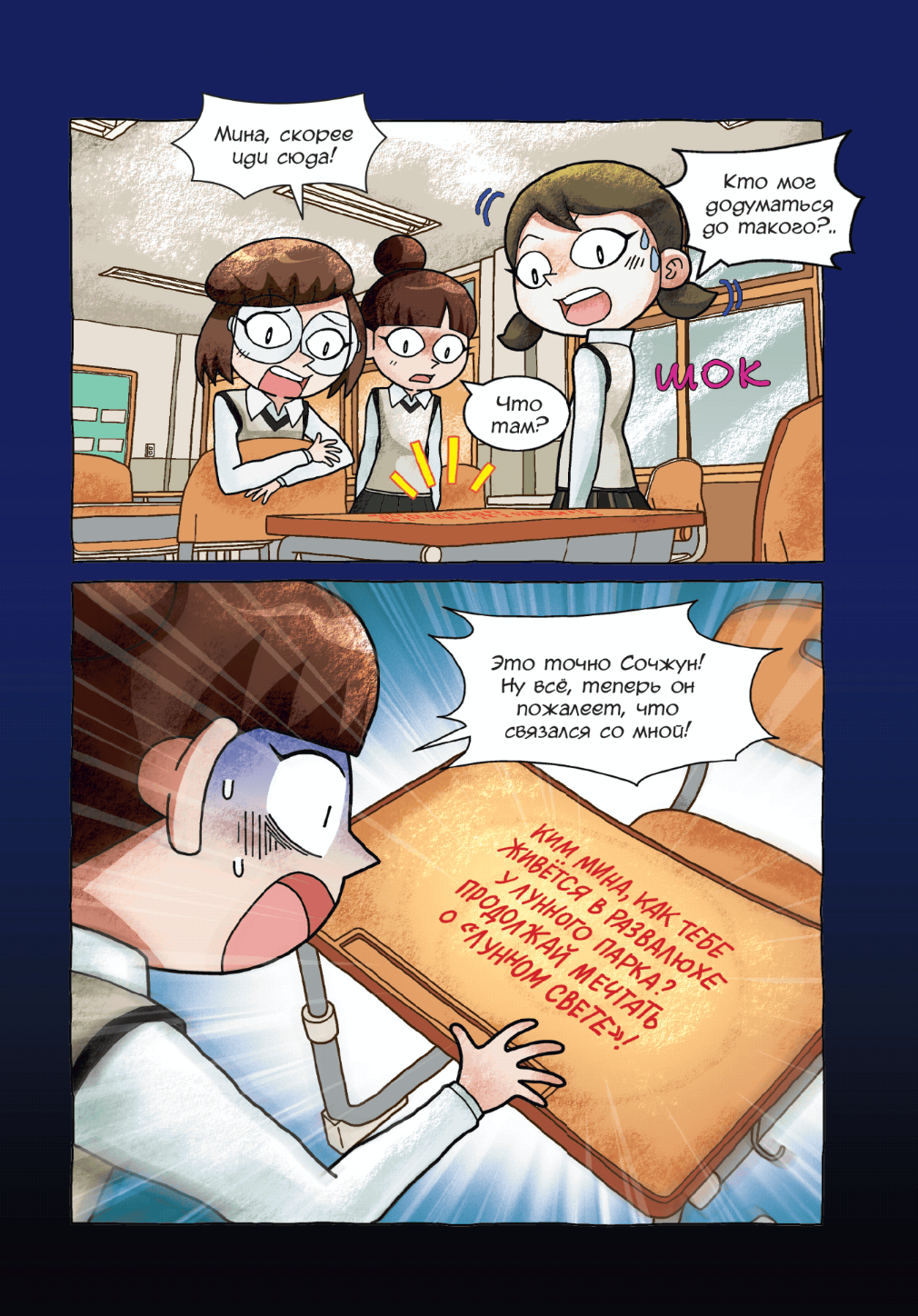 – Зазнайки из той части района называют «Лунный свет» помойкой. Ты знал, что недавно кто-то нарисовал граффити на одном из наших домов? Так вот, надпись была почти такой же, как в моём шкафчике! Уверен, это не совпадение, – снова прошептал Сочжун, показывая Хансэ фотографию своего шкафчика. Он повторял всё за Миной.