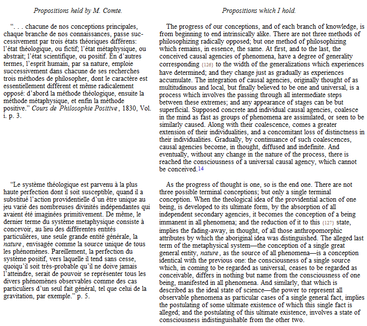 From the principles which M. Comte held in common with many preceding and contemporary thinkers, let us pass now to the principles that are distinctive of his system. Just as entirely as I agree with M. Comte on those cardinal doctrines which we jointly inherit; so entirely do I disagree with him on those cardinal doctrines which he propounds, and which determine the organization of his philosophy. The best way of showing this will be to compare, side by side, the —