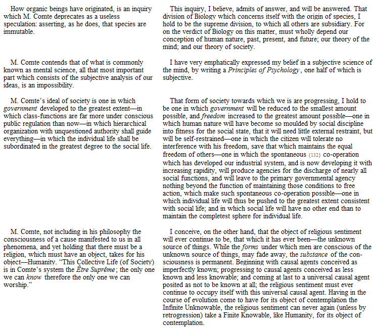 Here, then, are sundry other points, all of them important, and the last two supremely important, on which I am diametrically opposed to M. Comte; and did space permit, I could add many others. Radically differing from him as I thus do, in everything distinctive of his philosophy; and having invariably expressed my dissent, publicly and privately, from the time I became acquainted with his writings; it may be imagined that I have been not a little startled to find myself classed as one of the same school. That any who are acquainted with my writings, should suppose I have any general sympathy with M. Comte, save that implied by preferring proved facts to superstitions, astonishes me.