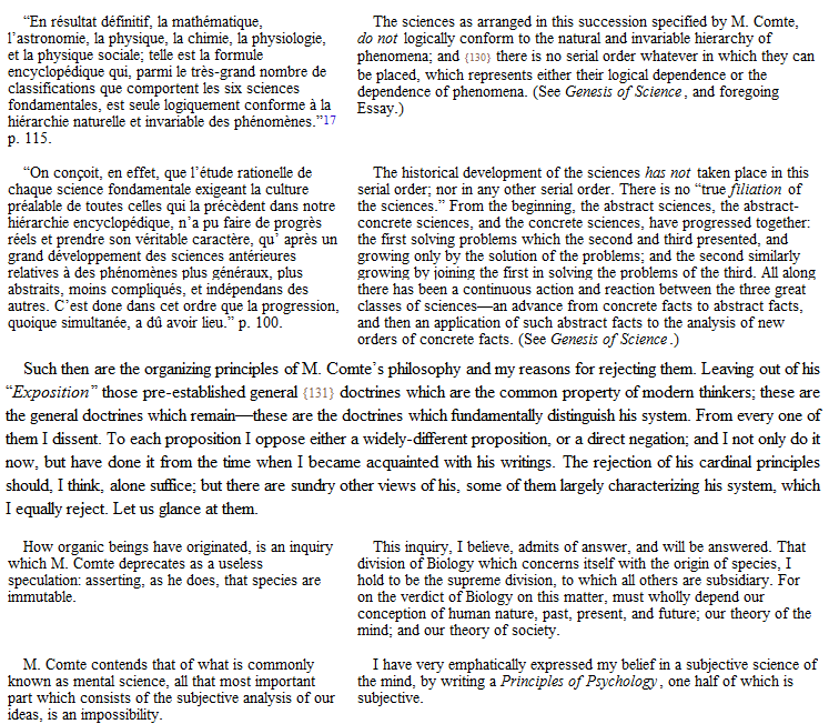 17In 1885, during a controversy with one of M. Comte’s English disciples, I was blamed for speaking “of Comte as making six sciences,” and was told that “in all Comte’s works, except the first, he makes seven sciences.” As I was dealing with The Positive Philosophy, I thought I could not do better than give the foregoing extract from the Cours de Philosophie Positive; and it did not occur to me that I was called upon to see whether, in any of his later voluminous works, M. Comte had made a different statement. My opponent, however, enlarged on this “blunder,” as he politely called it: apparently oblivious of the fact that if it was a blunder on my part to speak of Comte as recognizing six sciences when in his later days he recognized seven, it was a much more serious blunder on the part of Comte himself to have long overlooked the seventh.