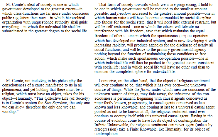 [ Originally published in April 1864 as an appendix to the foregoing essay.]While the preceding pages were passing through the press, there appeared in the Revue des Deux Mondes for February 15th, 1864, an article on a late work of mine – First Principles. To M. Auguste Laugel, the writer of the article, I am much indebted for the careful exposition he has made of some of the leading views set forth in that work; and for the catholic and sympathetic spirit in which he has dealt with them. In one respect, however, M. Laugel conveys to his readers an erroneous impression – an impression doubtless derived from what appears to him adequate evidence, and doubtless expressed in perfect sincerity. M. Laugel describes me as being, in part, a follower of M. Comte. After describing the influence of M. Comte as traceable in the works of some other English writers, naming especially Mr. Mill and Mr. Buckle, he goes on to say that this influence, though not avowed, is easily recognizable in the work he is about to make known; and in several places throughout his review, there are remarks having the same implication. I greatly regret having to take exception to anything said by a critic so candid and so able. But the Revue des Deux Mondes circulates widely in England, as well as elsewhere; and finding that there exists in some minds, both here and in America, an impression similar to that entertained by M. Laugel – an impression likely to be confirmed by his statement – it appears to me needful to meet it.