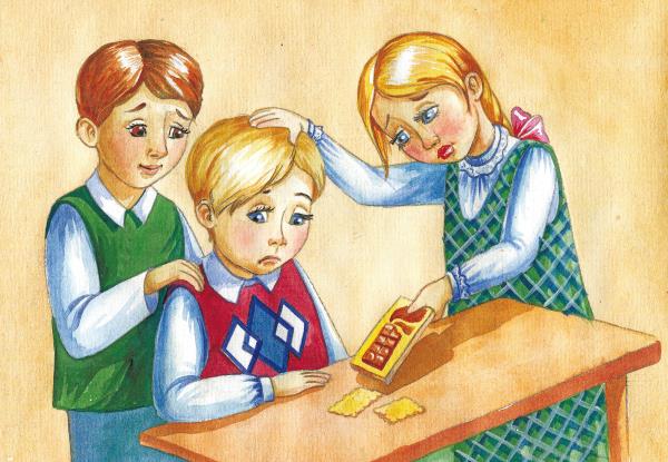 – Какой ужас, бывает же такое!.. – стали перешёптываться одноклассники, подходить и тоже гладить Кашкина. И подарили ему – кто шоколадку, кто конфетку, а кто печеньице. Чтобы полегчало у него на душе…