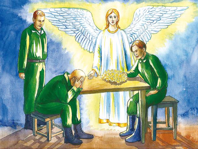 Сказал он, скинул с себя плащ до земли, весь в дырах от пуль и осколков, и все увидели, что это Ангел. Взмахнул он крыльями и полетел ввысь, прямо через потолок.