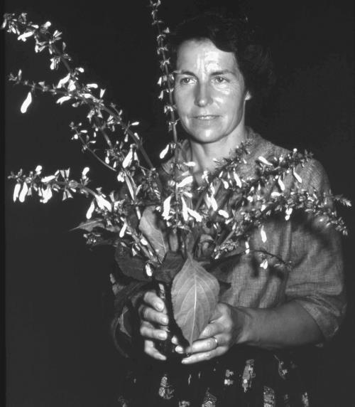 Анита Хофманн, жена Альберта Хофманна, с букетом психоделических растений Salvia divinatorum (вверху); Ipomoea violacea (утренняя слава), источник психоделических семян Олилуоки (слева внизу); Brugmansia (ангельская труба), растение семейства Solanaceae, содержащее психоактивное вещество атропин, скополамин и гиосциамин (справа внизу).