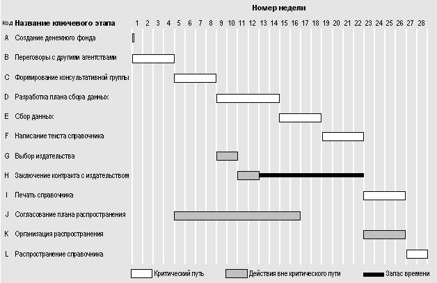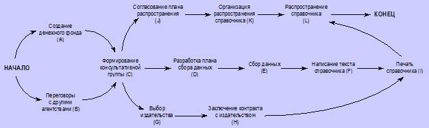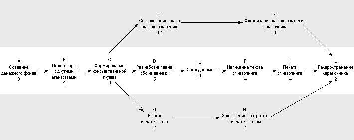 Вы должны отметить, что нуждаетесь в одобрении использования ресурсов (А), что может включать в себя разрешение на привлечение к участию в проекте других работников компании и ведение переговоров с ними (В). Вы сможете счесть необходимым создать некий управляющий комитет (С), что зачастую является хорошей идеей, поскольку помогает завоевать поддержку проекта. Вам могут потребоваться план сбора данных (D и Е), копирайтеры для написания текста (F), который необходимо напечатать, либо представить в подходящей электронной форме (I) и сделать каталог доступным всем потребителям. Производственному процессу должны предшествовать подготовительные этапы (G и Н). Вы также должны подумать о том, как каталог будет распространяться (J, K, L). Существенным является возможность реализации проекта посредством одновременного параллельного осуществления трех цепочек действий.