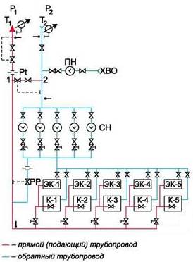 PД – регулятор давления P1; Рt – регулятор температуры T2; РР – регулятор расхода сетевой воды (в обход котлов); К-1+К-3- котлы ДКВр 10/13; К-4+К-5 – котлы ДКВр 6,5/13; ЭК-1+ЭК-5 – экономайзеры; СН – сетевые насосы; ПН – аварийный подпиточный насос; 1, 2 – точки подключения трубопровода – перемычки, стрелками показаны: точки замера температуры; и узлы учета расхода сетевой воды и тепловой энергии.