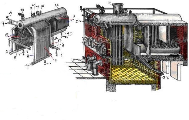 На рис.1.6 приведена схема устройства котла, на которой видны основные рабочие узлы котла, топочная камера, верхний и нижний барабан.