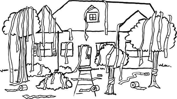 Я показываю на гирлянды туалетной бумаги, развешанные на деревьях.