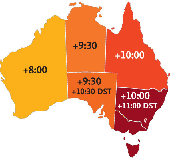 Australian time zones are shown on this map. There are three: Australian Western Standard Time (AWST); Australian Central Standard Time (ACST); and Australian Eastern Standard Time (AEST). Some individual states (Western Australia, Northern Territory and Queensland) do not use daylight saving time (DST) during the summer months. To obtain local (zone) time from Universal Time (UT), add the hours shown in this table. If the result is greater than 24, subtract 24 hours. If the initial or subsequent result is less than 12:00, the zone time is a.m.; if greater, subtract 12 hours to get the time p.m. The dates when Daylight Saving Time begins and ends are shown on the individual calendars inside the book. At the time of writing, it is introduced on the first Sunday of October and ends on the first Sunday in April.