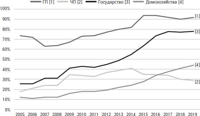 Деловые лидеры знают, что, когда речь идет о бизнесе, деньги имеют очень большое значение. Давайте для примера возьмем крупнейшую в мире по величине дохода от продаж компанию Walmart. Ее годовая прибыль за 2021 финансовый год составила 559 млрд долл. – больше, чем ВВП 172 из 193 стран-членов ООН. Впечатляюще, да? И все же ни Walmart, ни любая другая компания и близко не подошли к уровню финансовой мощи Корпорации Китай. Например, в 2020 году ГП Китая получили около 9,7 трлн долл. прибыли[12], что примерно в 18 раз больше дохода Walmart за тот же год (519 млрд долл.). На долю этих компаний приходится 60 % капитализации всех китайских фирм и 30 % ВВП Китая. На активы ГП приходилось примерно 60 % ВВП, или около 8,6 трлн долл.[13]. Целая куча денег, но есть еще кое-что – заемный капитал. ГП имеют доступ к 13,2 трлн долл. посредством займов, а это 92 % ВВП Китая (рис. 1.9).
