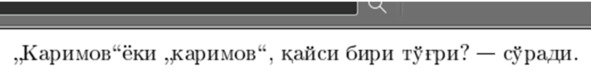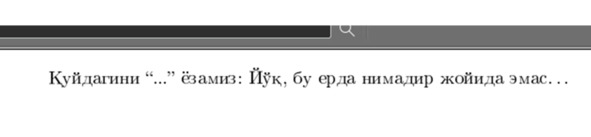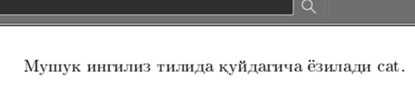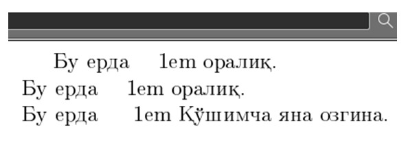Ushbu turdagi bosma ingliz tipografik qoidalariga mos keladi, ammo rus matnlarida so‘zlar va jumlalar orasidagi bo‘shliqlar bir biridan farq qilmasligi kerak. Buning uchun preambldagi \frenchspacing kamandasini kiriting. Ushbu turdagi bosma ingliz tipografik qoidalariga mos keladi, ammo rus matnlarida so‘zlar va jumlalar orasidagi bo‘shliqlar ular farq qilmasligi kerak. Buning uchun buyruqni preambula kiritishingiz kerak.